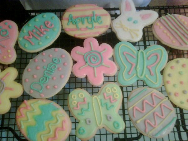 I was baking my cookies and realized I didn’t have enough so I went to the store to buy more cookie dough stuff… While I was waiting for the dough to chill I started out on my icing. The finished ones went on a tray in my back bedroom to be out of my way. I shut the door so that the pets can’t get in there. So then I started in on my baking (music blasting as always) and finished up right before my husband got home. As he walked around the corner he noticed the back room door was open… my puppy got the door open, knocked down the tray of cookies and was nearly done eating them all! Final count at the end was a loss of 22 cookies! Needless to say I was beyond pissed. And the puppy was on a sugar high till 2am that night!