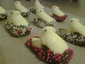 So I also chocolate dipped some peeps! I was inspired by this post and since one of my coworkers is OBSESSED with peeps I thought it would be fun to try. Here are the finished peeps waiting to dry: