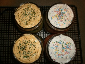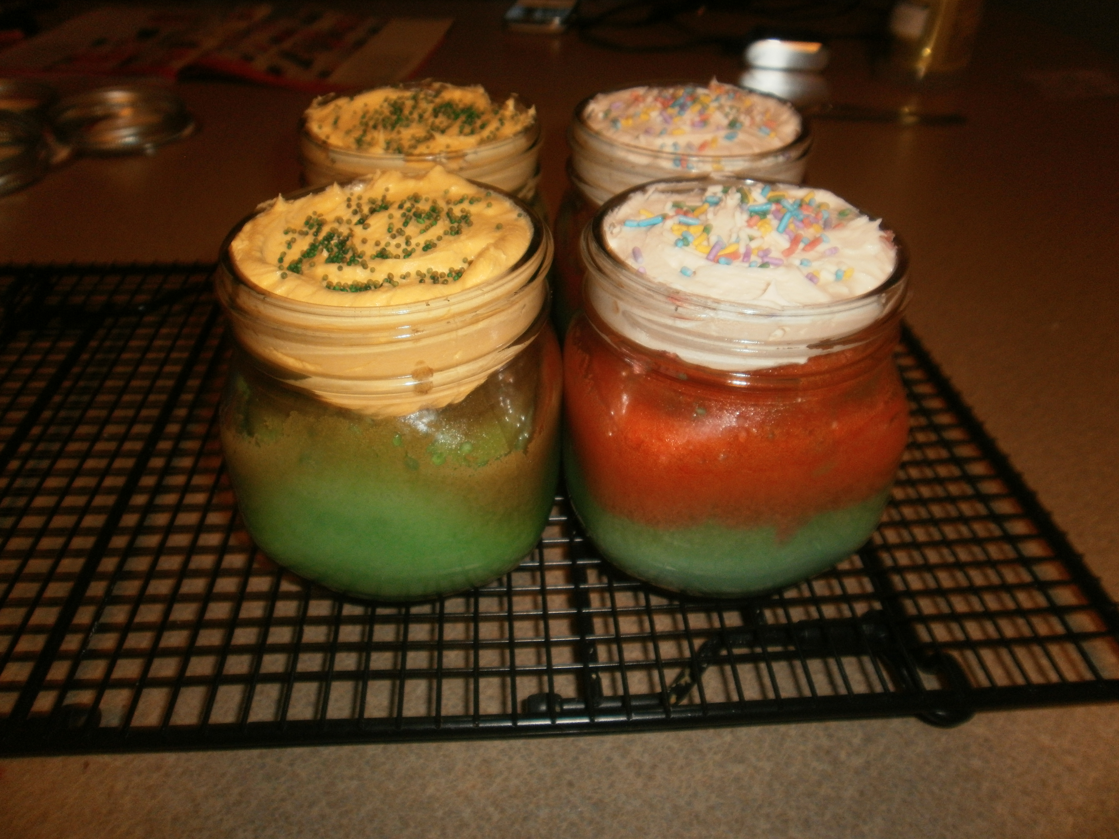 I filled the jars about 2/3 the way up, and the cake actually puffed out way more than I was expecting.. good 2 inches above the rim of the jar. One of them actually spewed down the side of the jar. I had read that this might happen a little, and so I just scooped the top off to make room for the frosting.