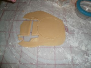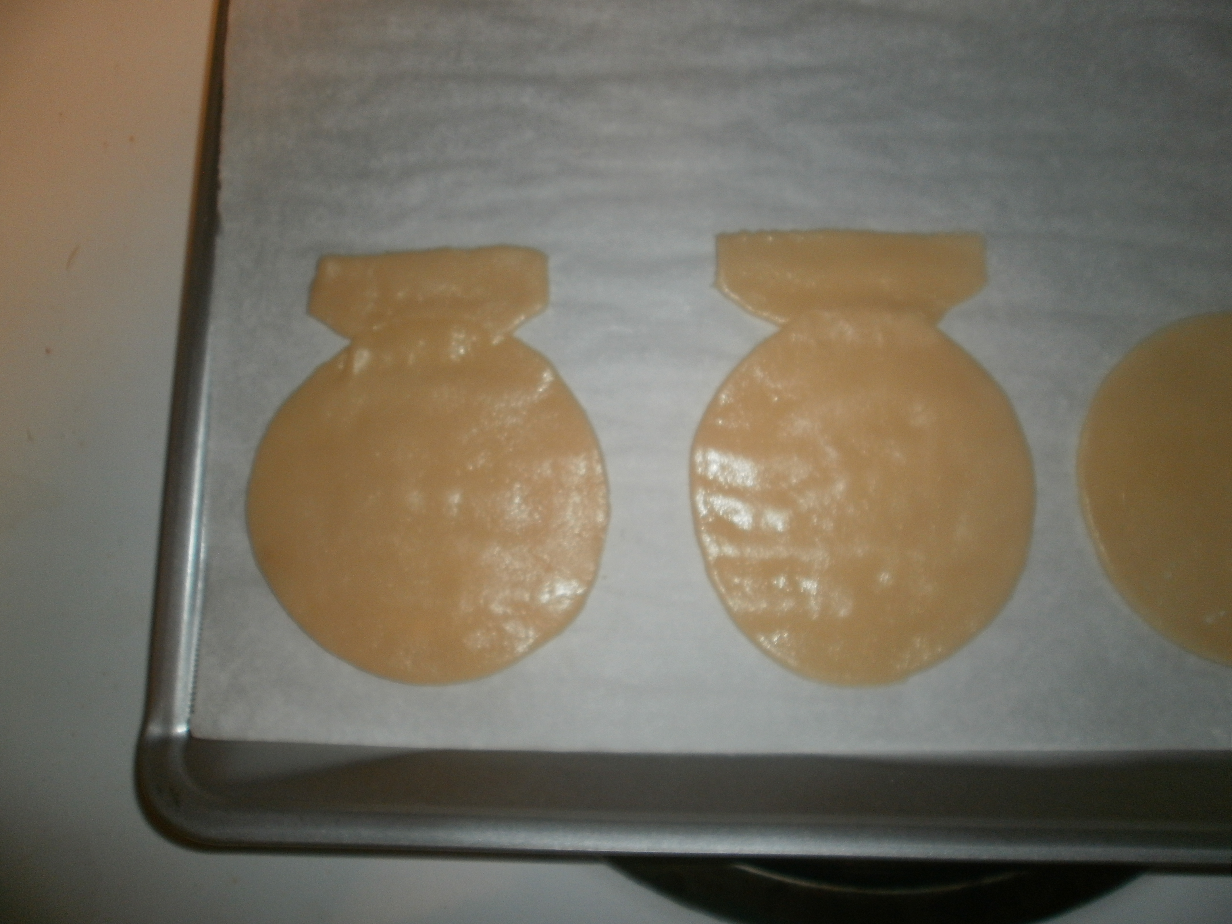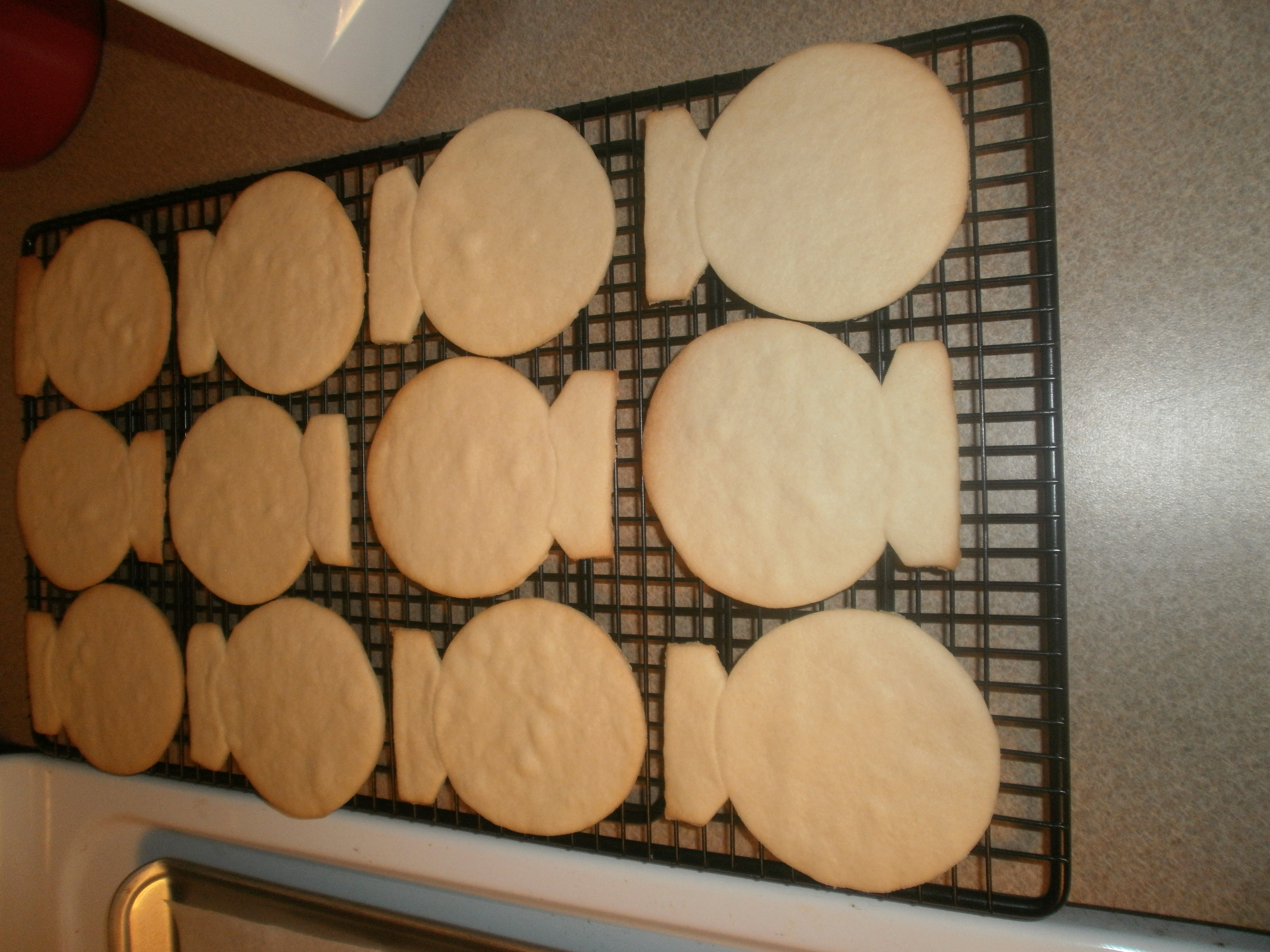I used my circle cookie cutter, and the top of my onesie cookie cutter. I chopped off the arms so that I basically just had the shoulder section. Stuck it to the circle, and they were ready to bake!