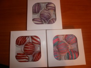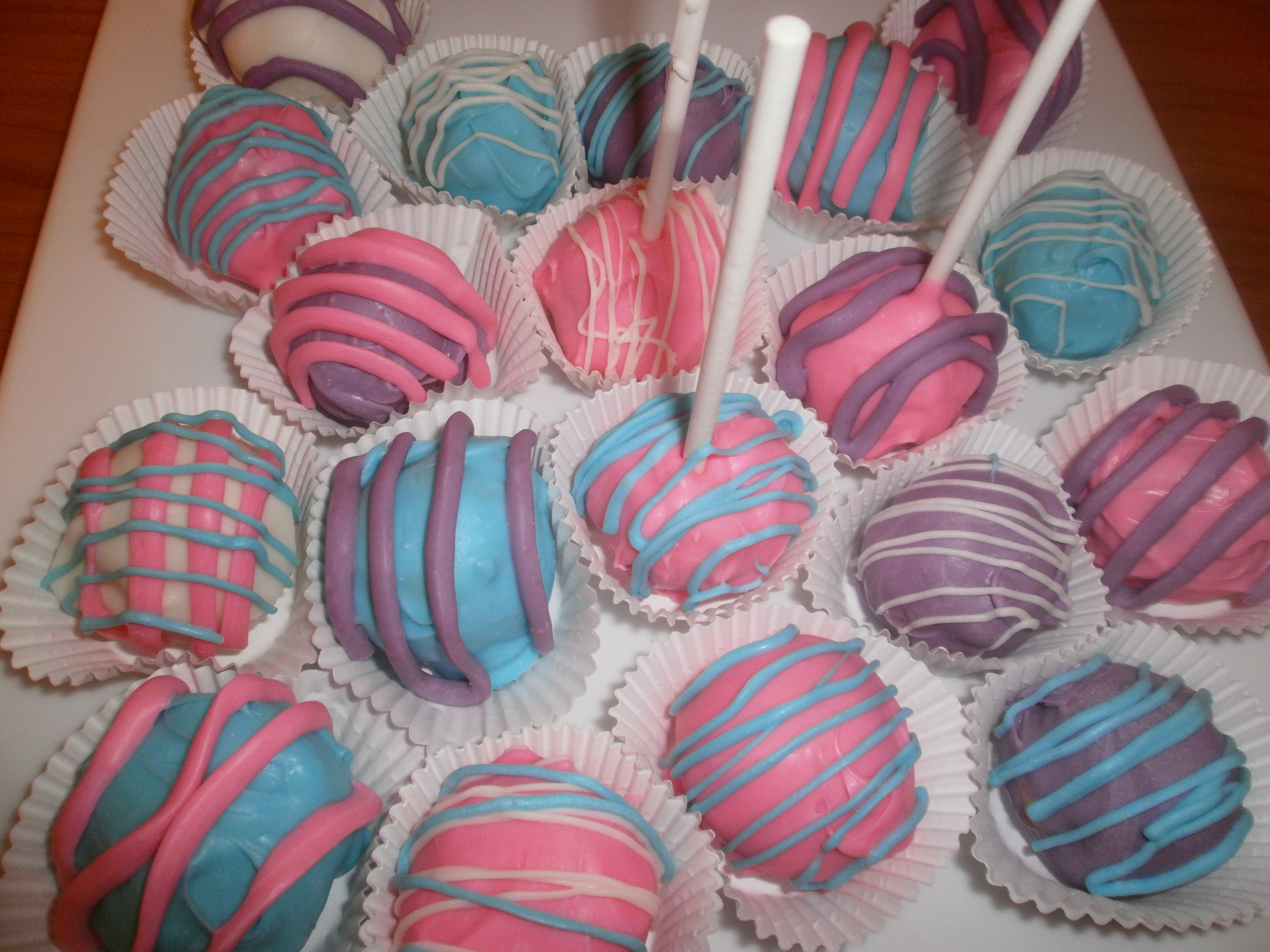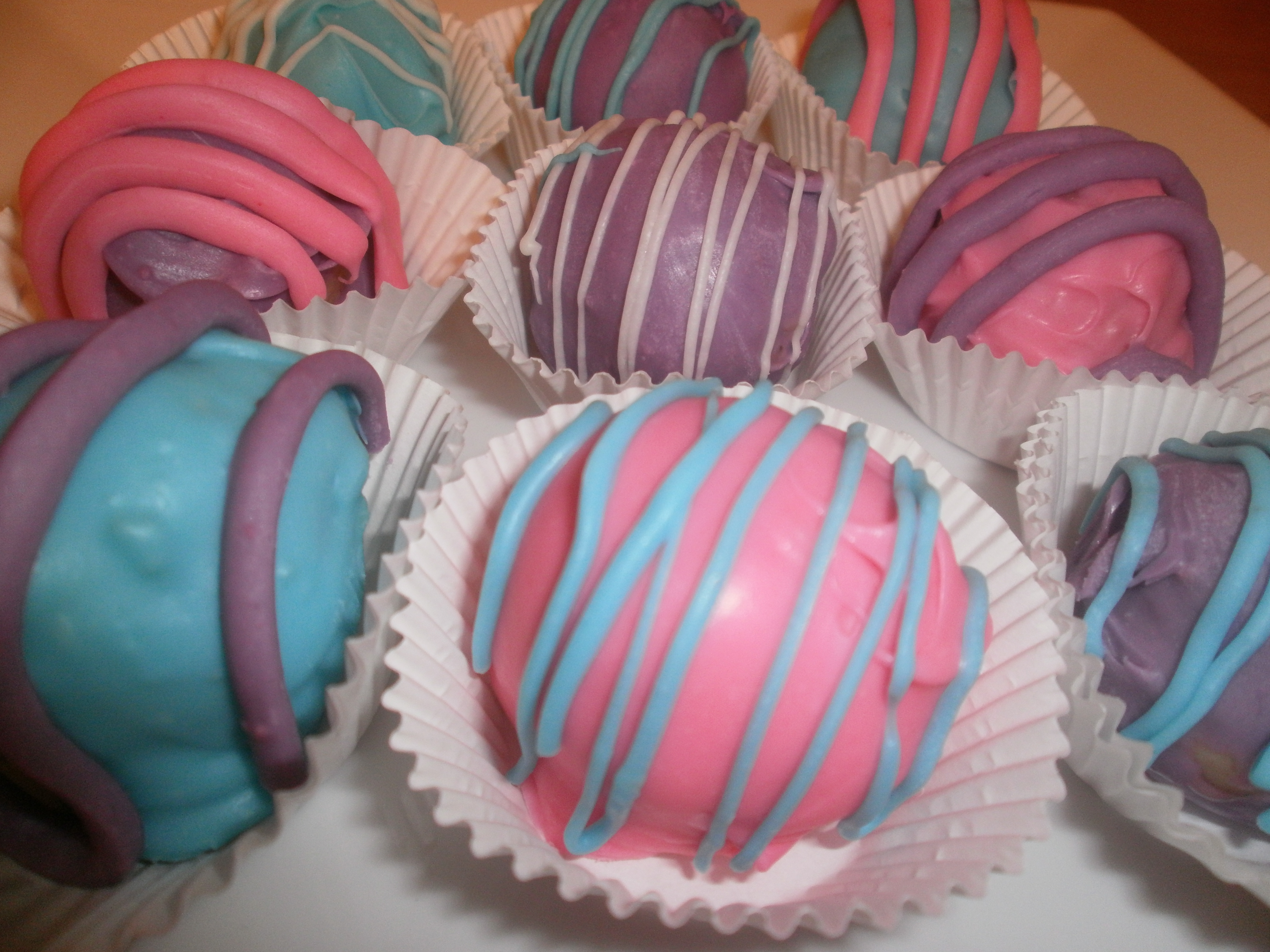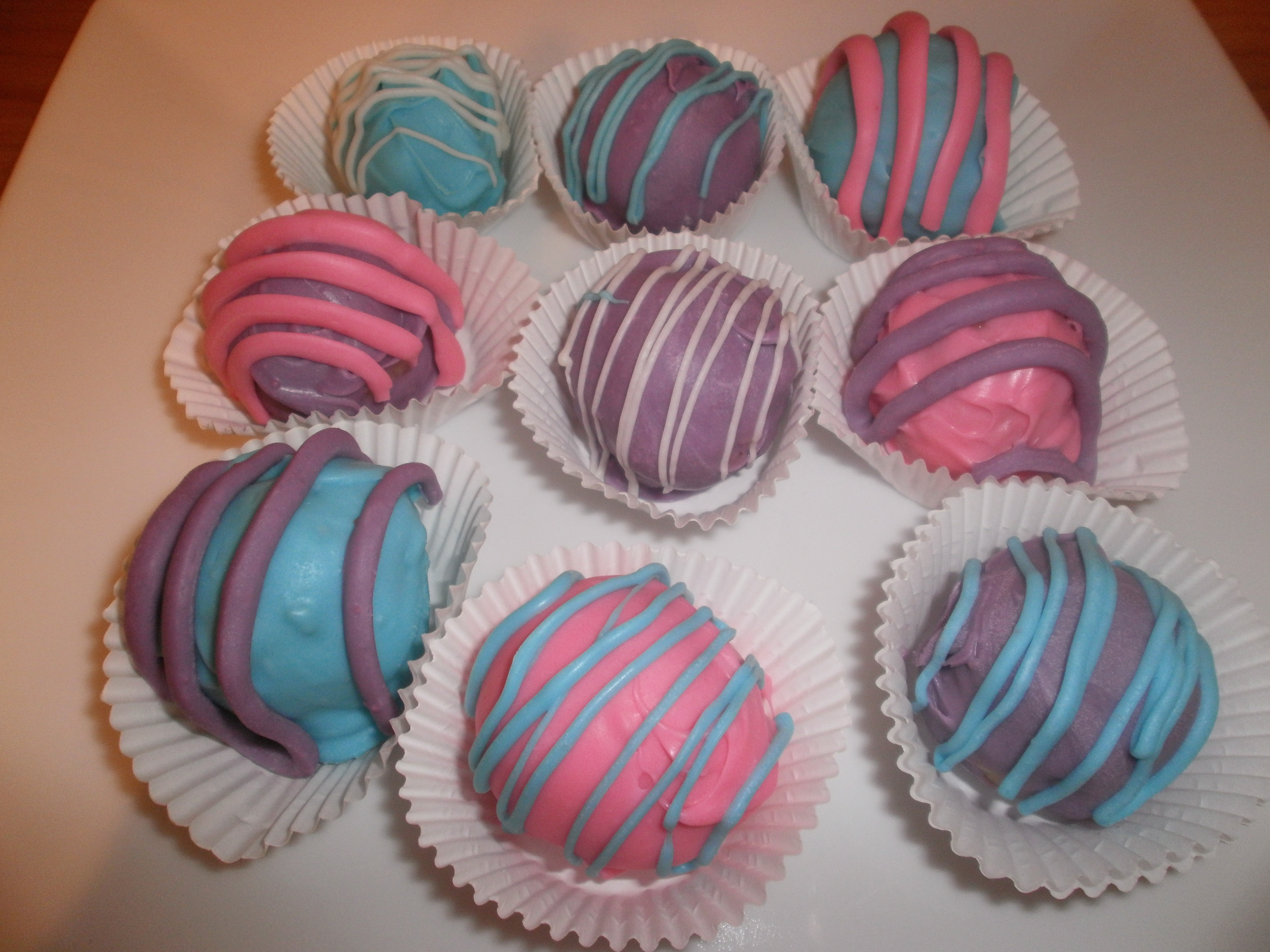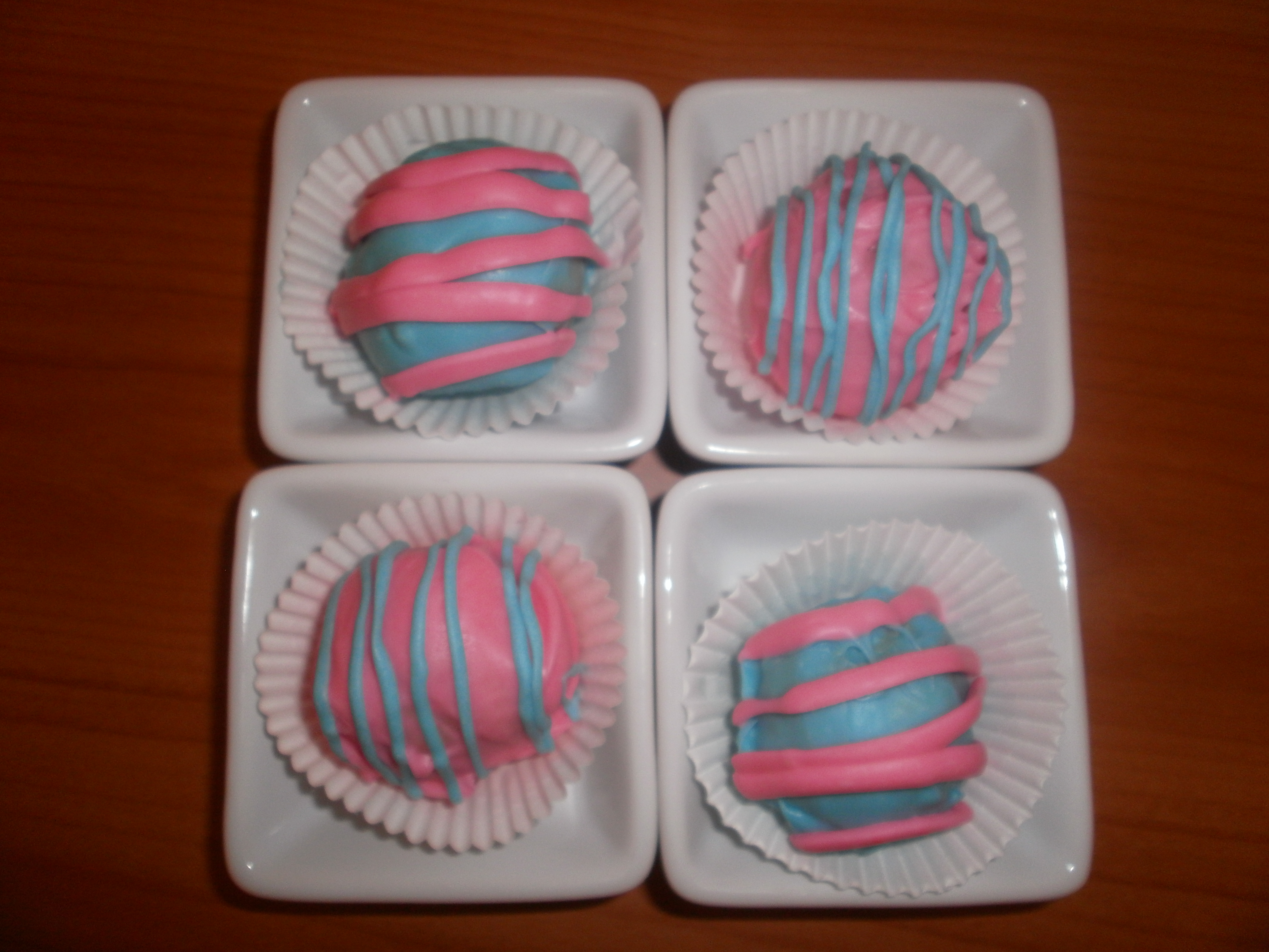 They sat in the fridge/freezer for a few minutes, then they were dipped in candy melts. These I was making for a friend’s birthday, so I did her favorite colors.