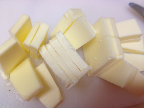 Butter should be room temperature. This does not mean goopy (that’s a technical term), and it definitely does not mean melty. I’d say it should be out of the fridge for at least 30 minutes. (Still shaped like a stick of butter, just not rock hard.) Alternatively, you can cheat like I usually do! I take the butter directly out of the fridge and cut it into pats – thinish slices.