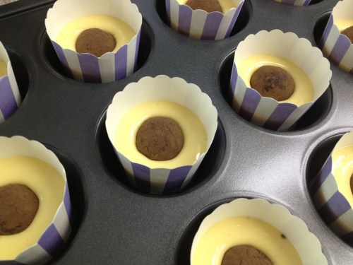 5. Scoop or pour batter into cupcake liners to about 1/3-1/2 way. Drop a ganache ball into each cupcake.
