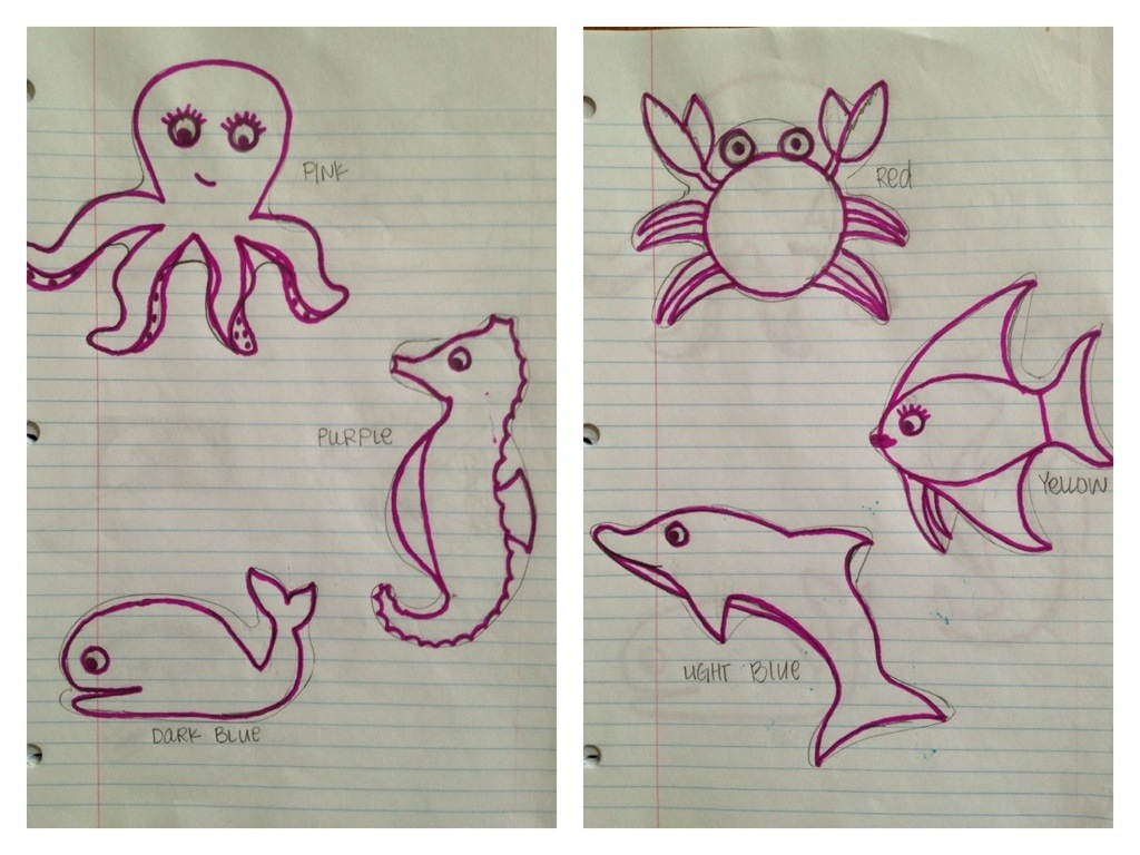 For this sea creatures set, I traced each of the animals once and did a lot of erasing until I was happy with each animal. I wanted the whole set to have the same “feel” of simple and cartoon-ish, and I knew I wanted them all to have the same eyes. One couldn’t be too much more detailed than the rest so it helped me to have them all together on one page like this.