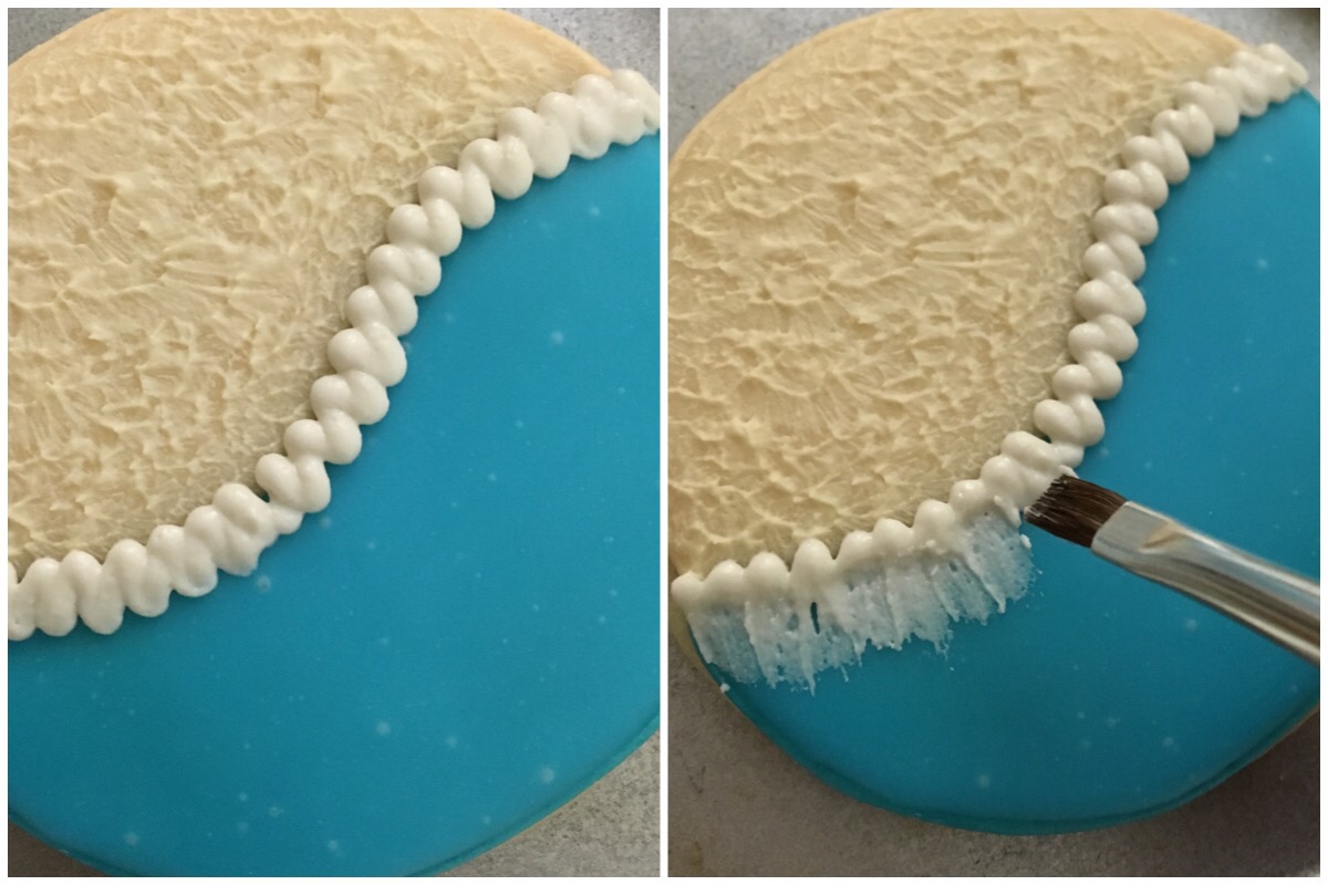 Piped a small right zigzag across the edge of the beach, then using another flat tipped paint brush, brushed away half of the line of frosting. This created a perfect lapping wave look!