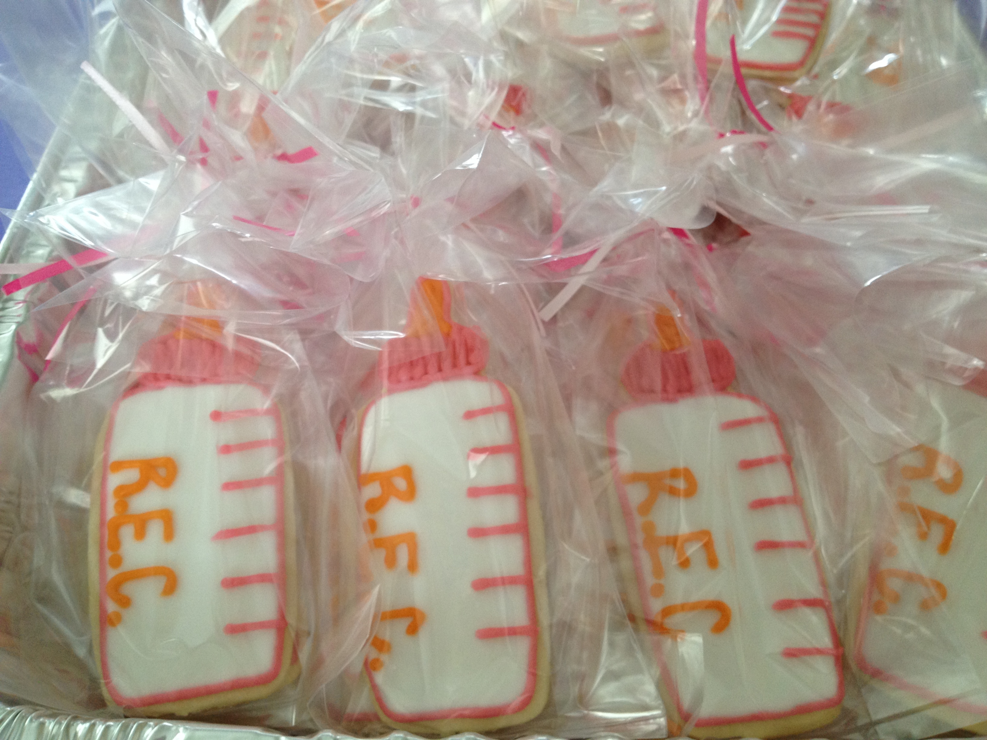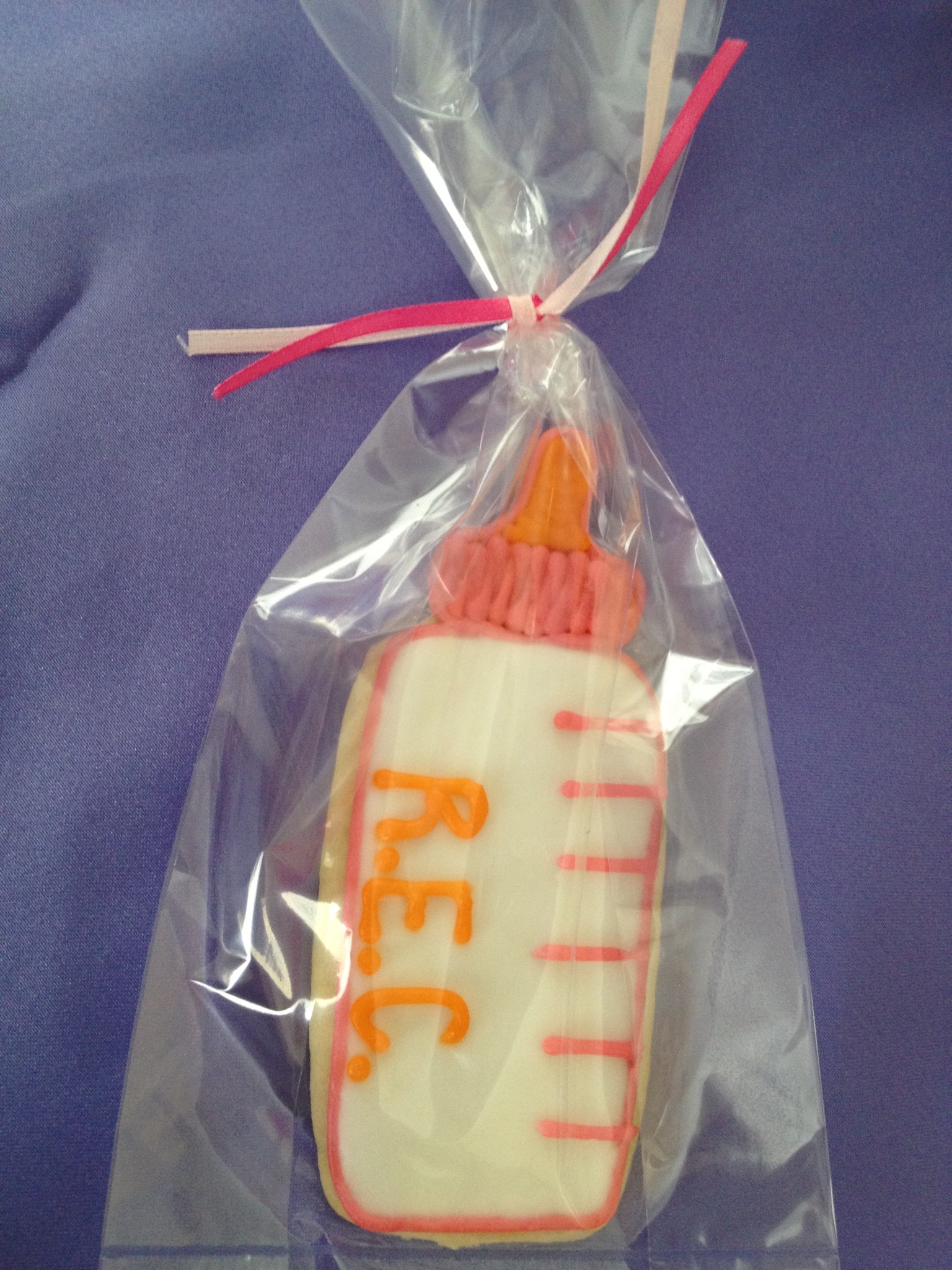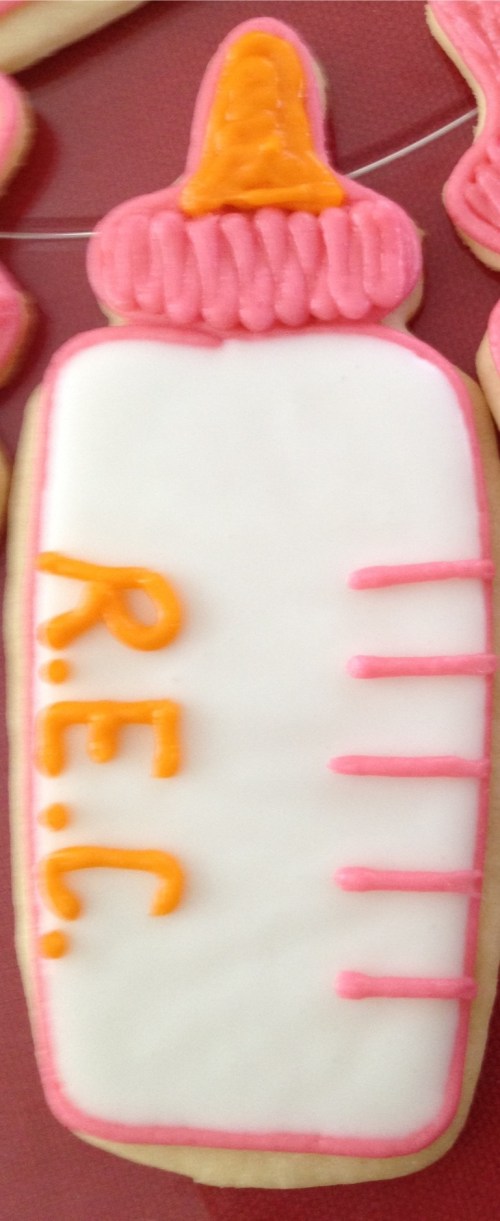 I bought a baby bottle cookie cutter to make matching cookies. This baby is 5″ tall!