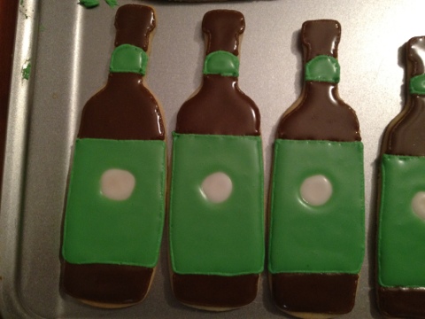 Once the green was set, I outlined the rest of the bottle and carefully filled it in without letting any of the brown icing touch the still-wet green icing. It did touch on a few. I used those for practice when it came to the next steps…