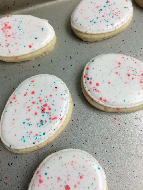 Then used a straight edge paintbrush and a toothpick to “flick” coloring all over the cookies.
