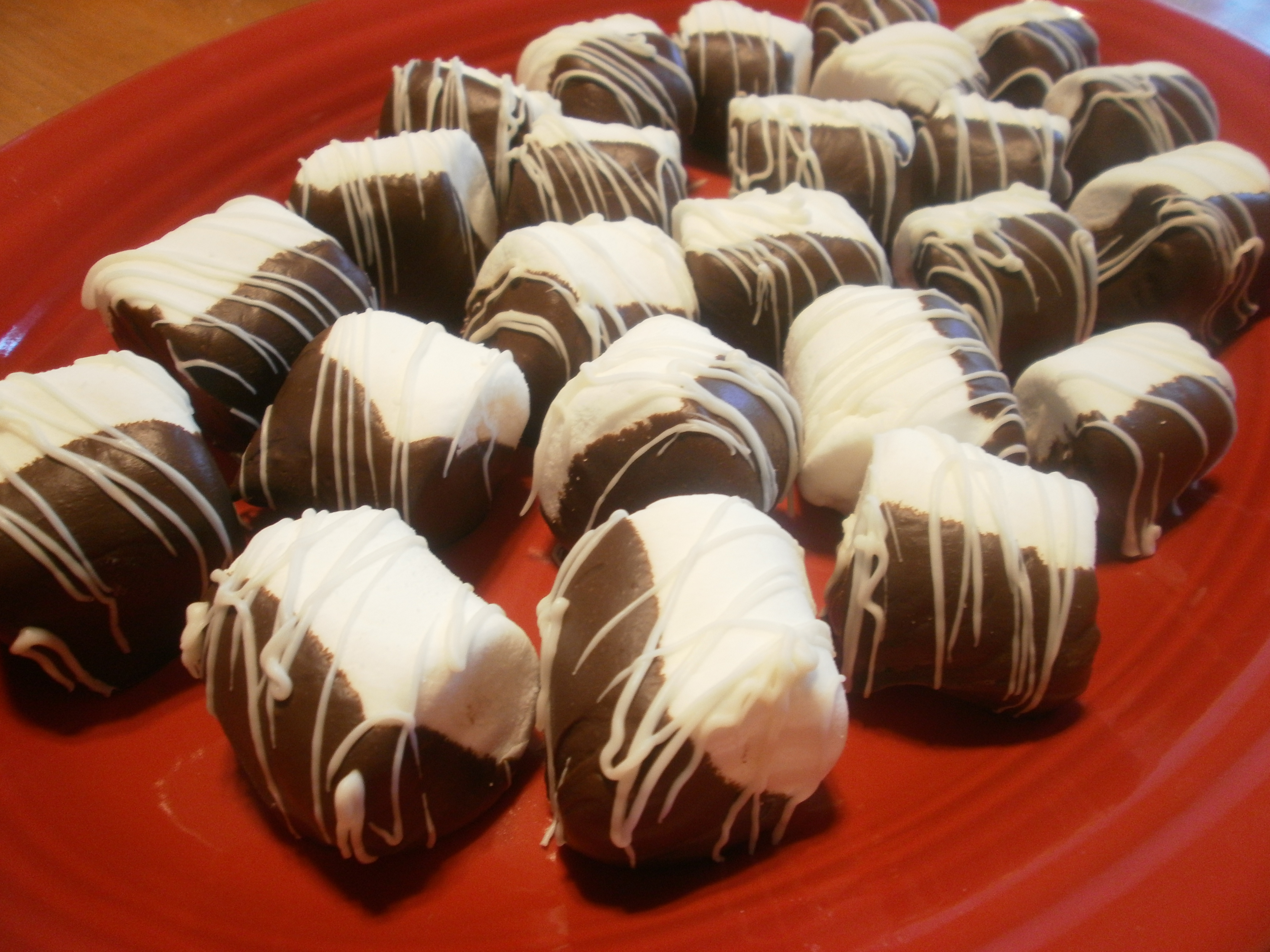 Because the mallows were dusty and I didn’t want it to get into my chocolate, I pressed the mallow into the melted chocolate, covered it with chocolate without moving it around. Then I just lifted it out with a fork and tapped it on the edge until all the excess chocolate dripped off. Then used a knife to gently scrape the mallow off the fork onto wax paper.