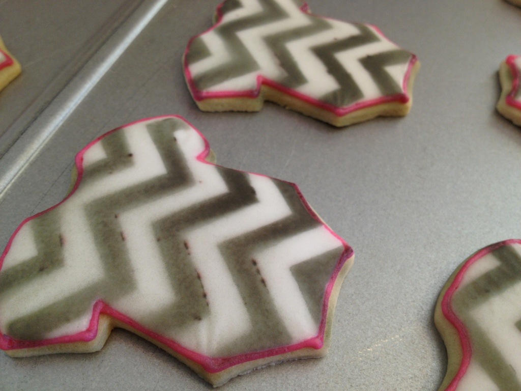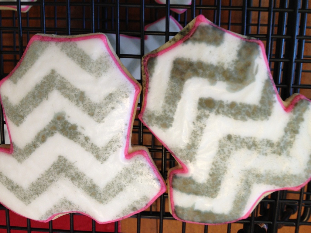 Then I just laid it across the cookies and sprayed it with Wilton color mist. Since the stripes had to be grey, I used black color mist and just did a light coat. (Obviously if you have an airbrush that would be better.)