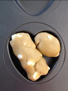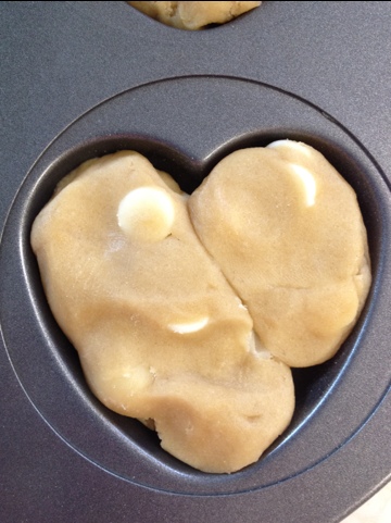 I recently bought myself a whoopie pie pan aka muffin top pan, and since it was during Valentine’s season, it is heart shaped! And since my honey isn’t getting his giant heart shaped cookie, I figured I would make him regular-sized heart shaped white chocolate macadamia nut cookies. Ugh this post is getting me tongue-tied!