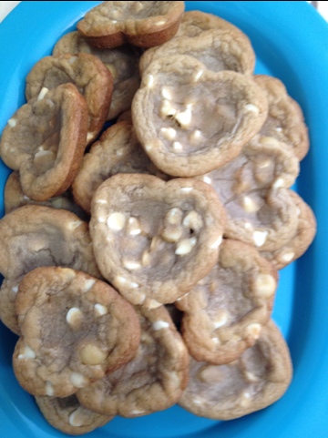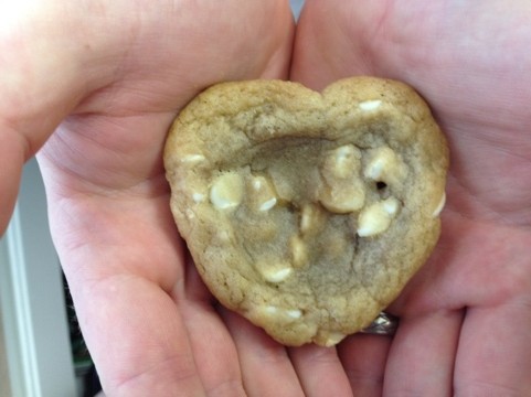 For the past few years, I have bought my honey a giant heart-shaped cookie for Valentine’s Day. (By giant I mean it was like 12″ across.) His favorite cookie is a white chocolate macadamia nut, so the giant cookie was always that. Now that I am doing my own baking, I told him he was not getting one this year. I asked him what I could make him instead. He wants damn white chocolate macadamia nut cookies. Of course.