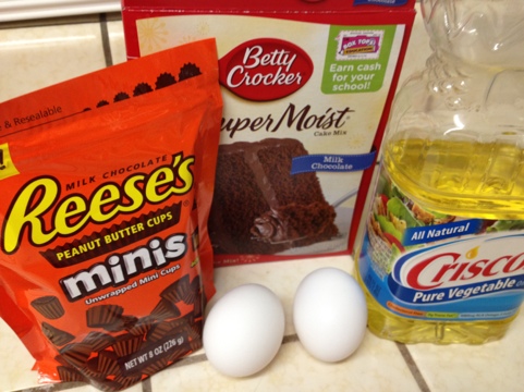 Mix a boxed chocolate cake mix (I used Milk Chocolate flavored), 2 eggs, and 1/3 cup of vegetable oil.
