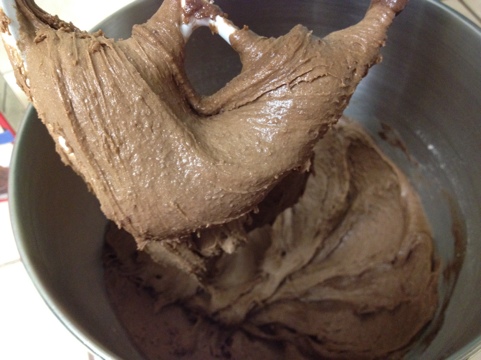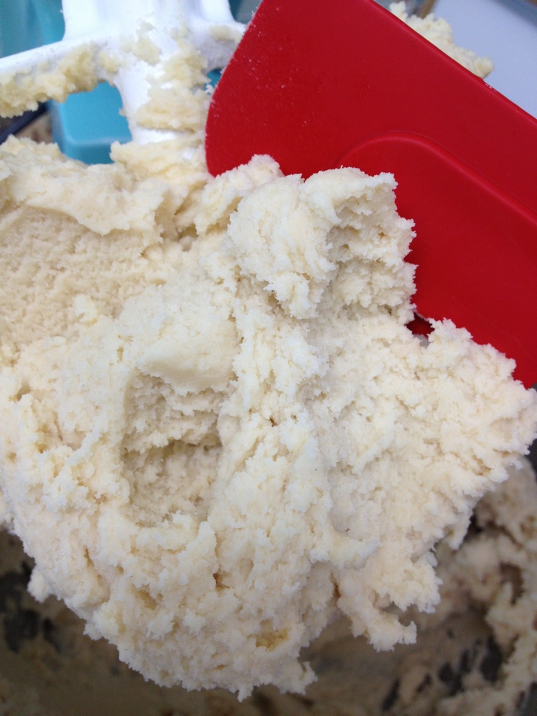 3. Add flour/nut mixture to butter mixture a little at a time until fully incorporated. The batter was very thick; I had to make husband stir it with a wooden spoon because my mixer couldn’t take it.