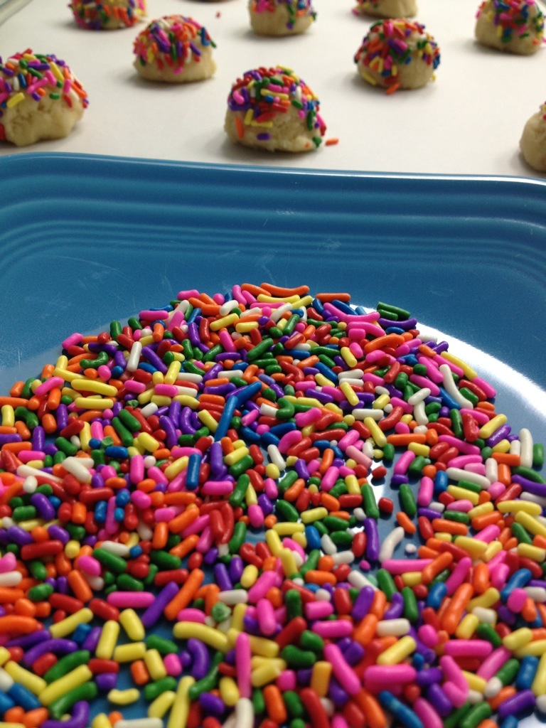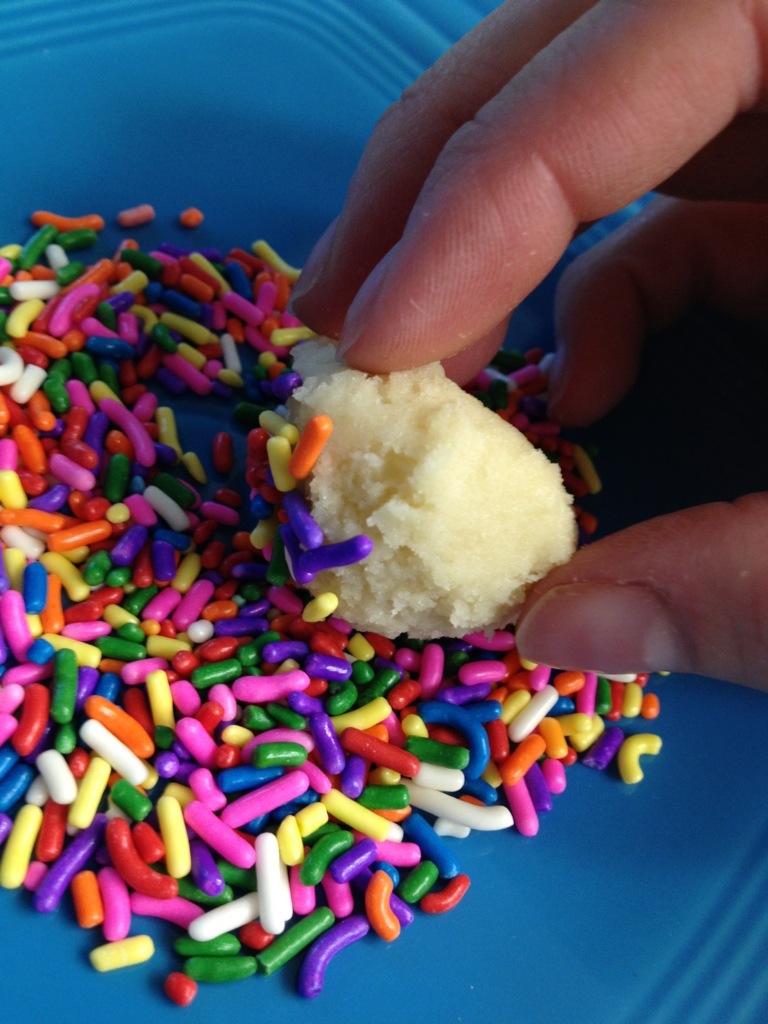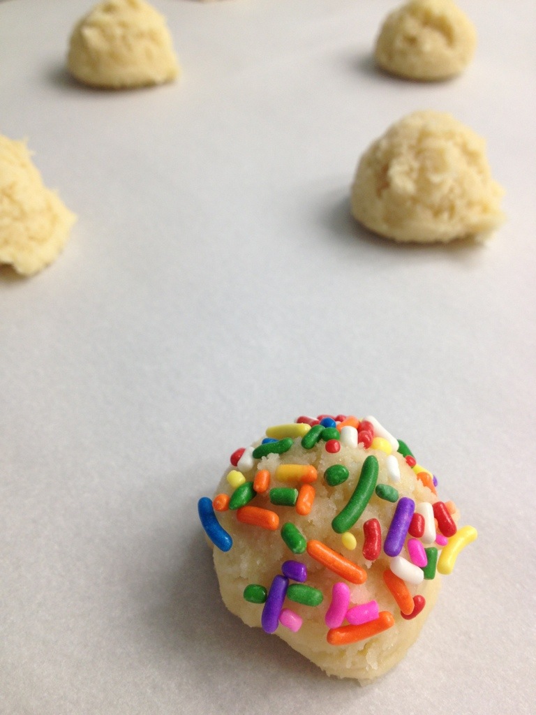 3. Scoop dough into approximately 1″ balls. I used my small cookie scoop. Roll the tops in sprinkles (I used jimmies) and place 2 inches apart on a parchment or silicone lined baking sheet.