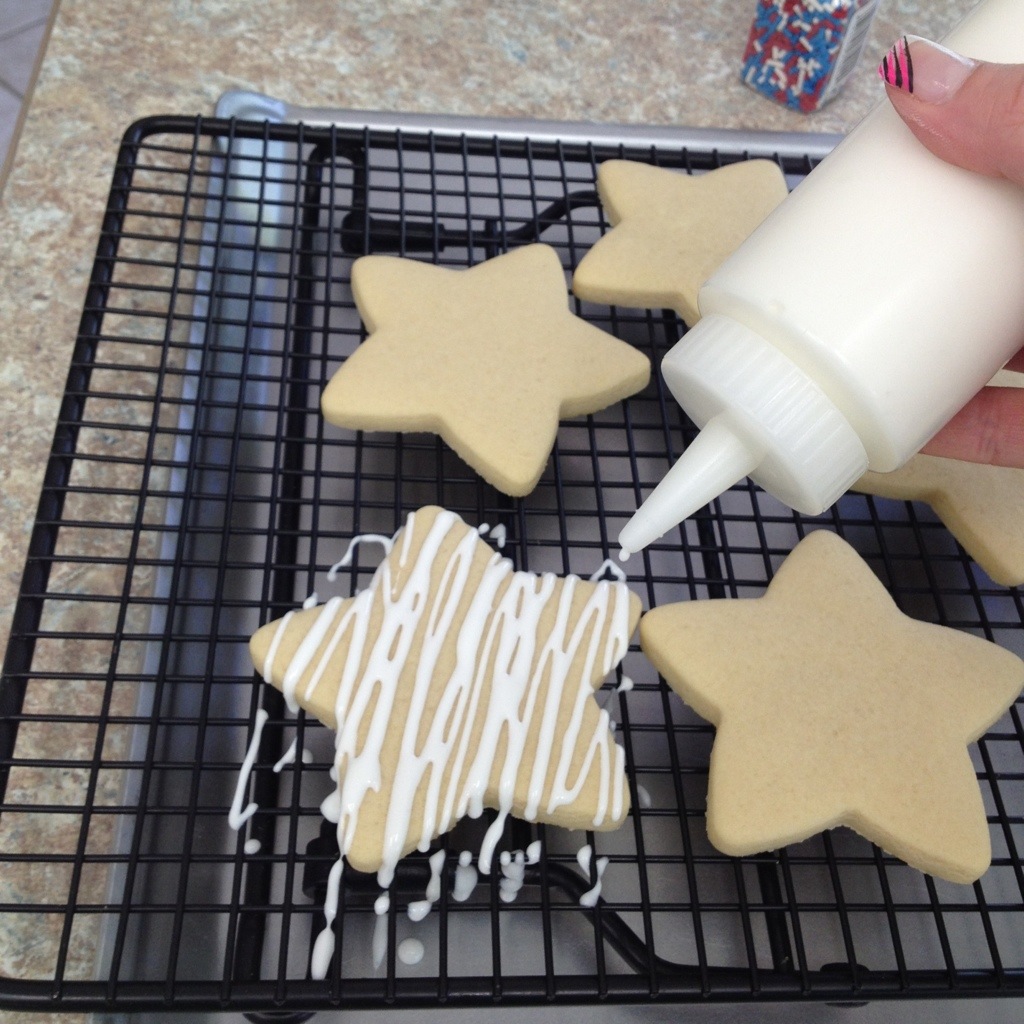 Mix up your icing and put into a squeeze bottle or zip-top baggie with the corner cut. Drizzle haphazardly across the cookie in the same back-and-forth direction. I just used white icing for simplicity, but colored icing, or multiple colors drizzled together would look super cute!