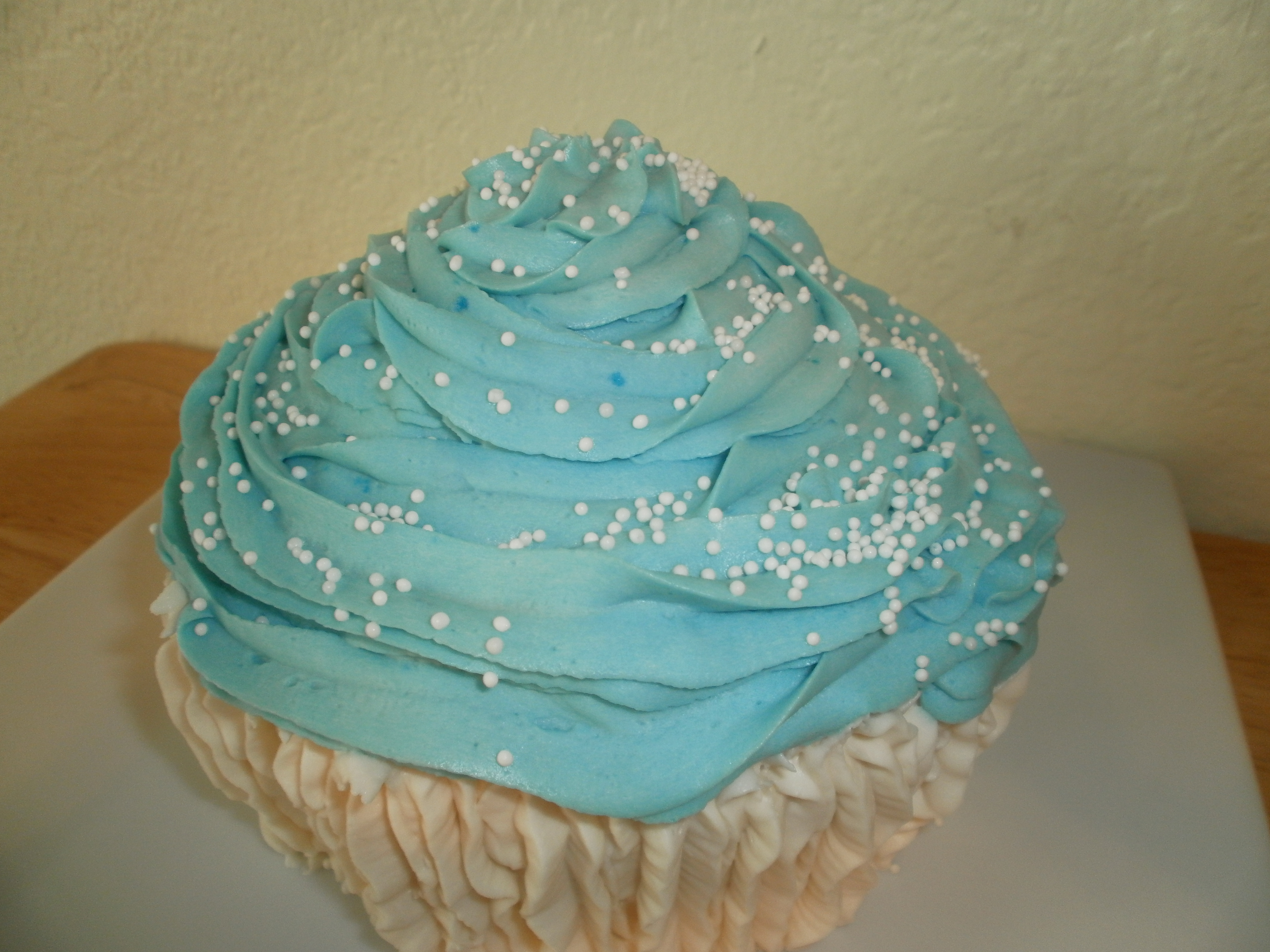 Back to the giant cupcake. I leveled off the base, and slapped on some dark blue buttercream that was leftover from the cookies. While leveling off the top, it started to fall apart. Bottom was done is white buttercream, and the top in light blue. Everything can be fixed with more frosting though right? Eh, it’s up for debate.