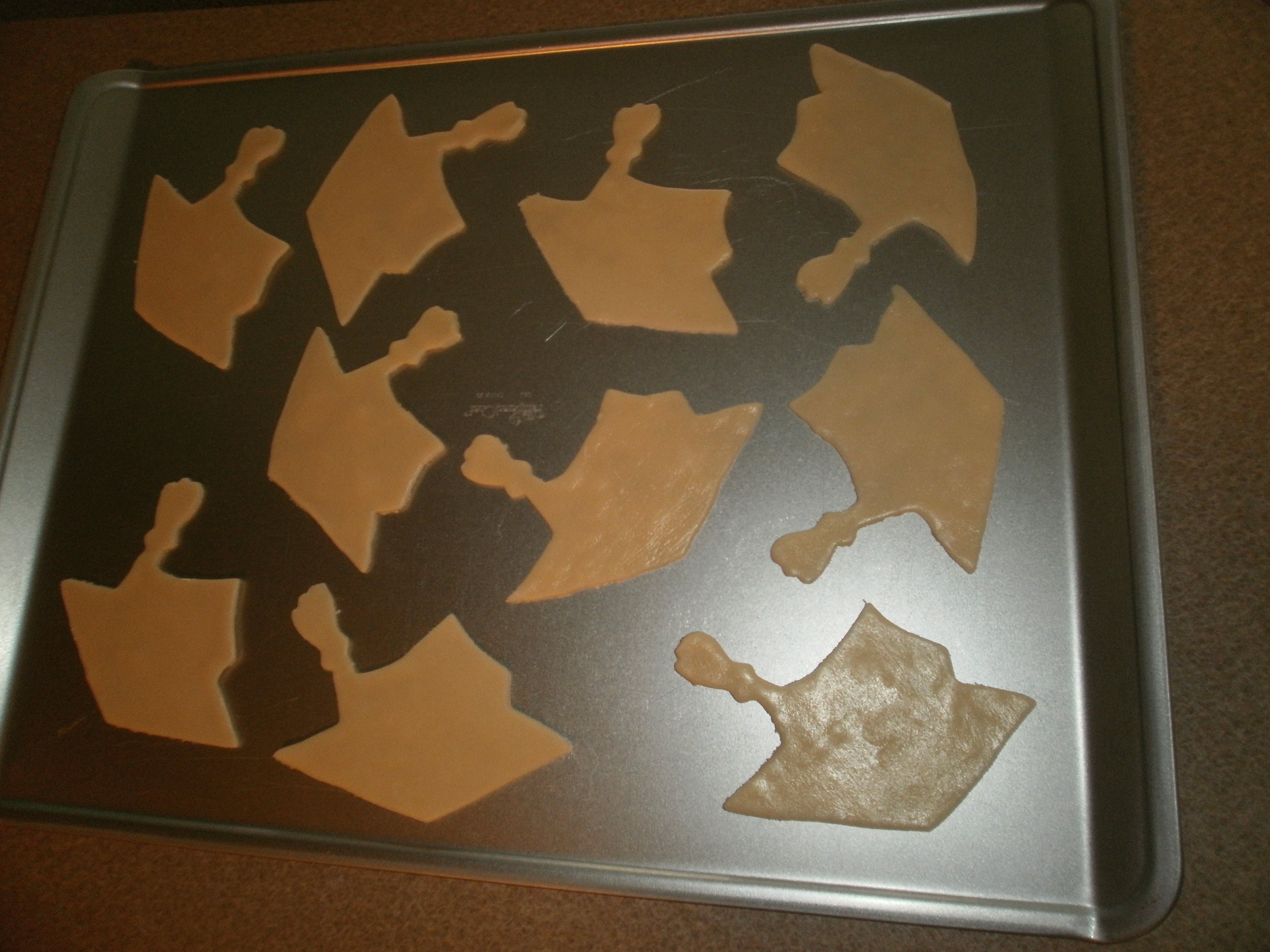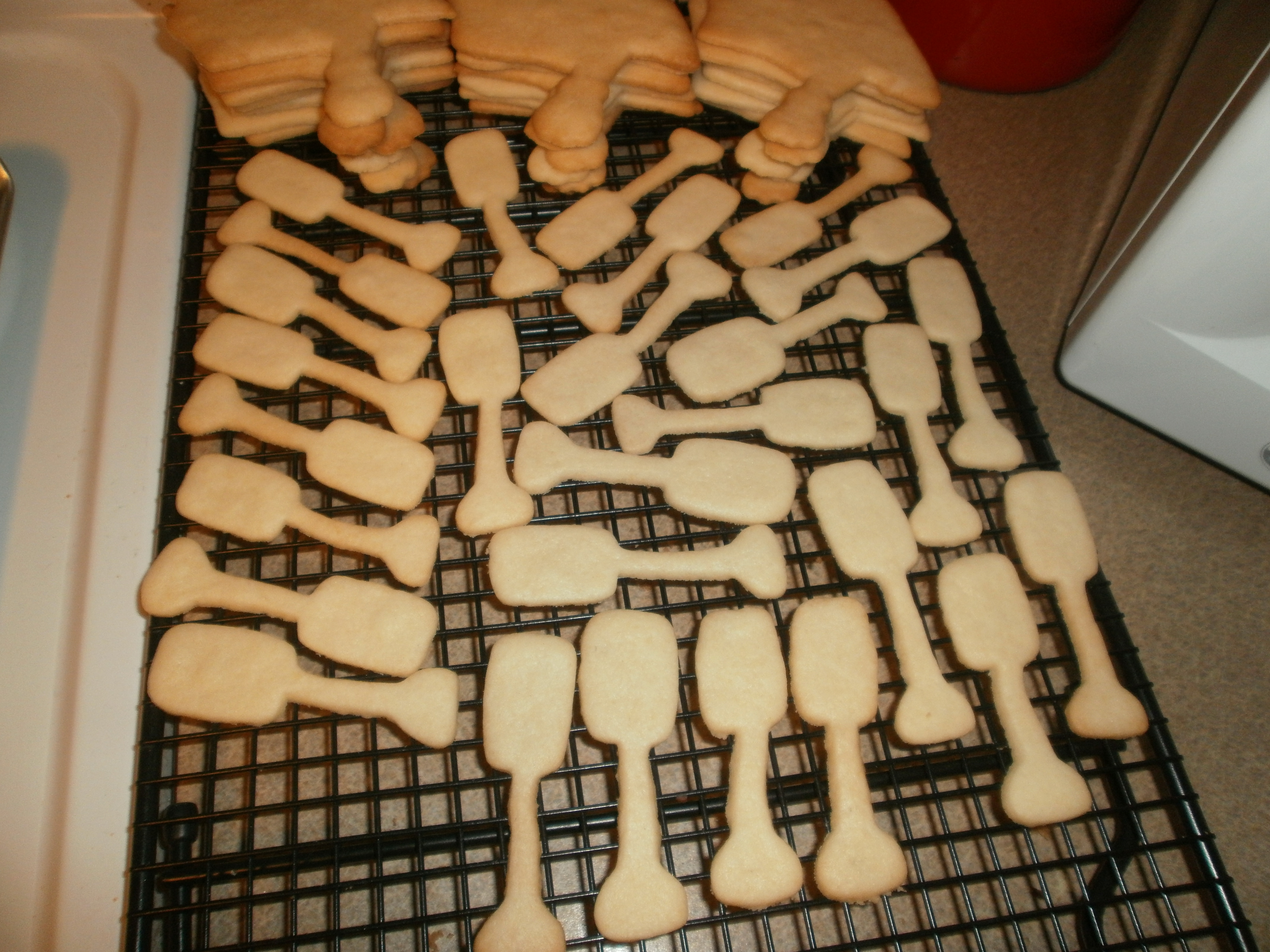The oars on the other hand, were a pain in the you -know-what. They are about 4 inches long but only about 1/2 inch wide at the paddle part. the mid section is SO skinny that I had to carefully straighten them all out before I baked them. I broke lots just trying to get them off the pan. Here is what survived: