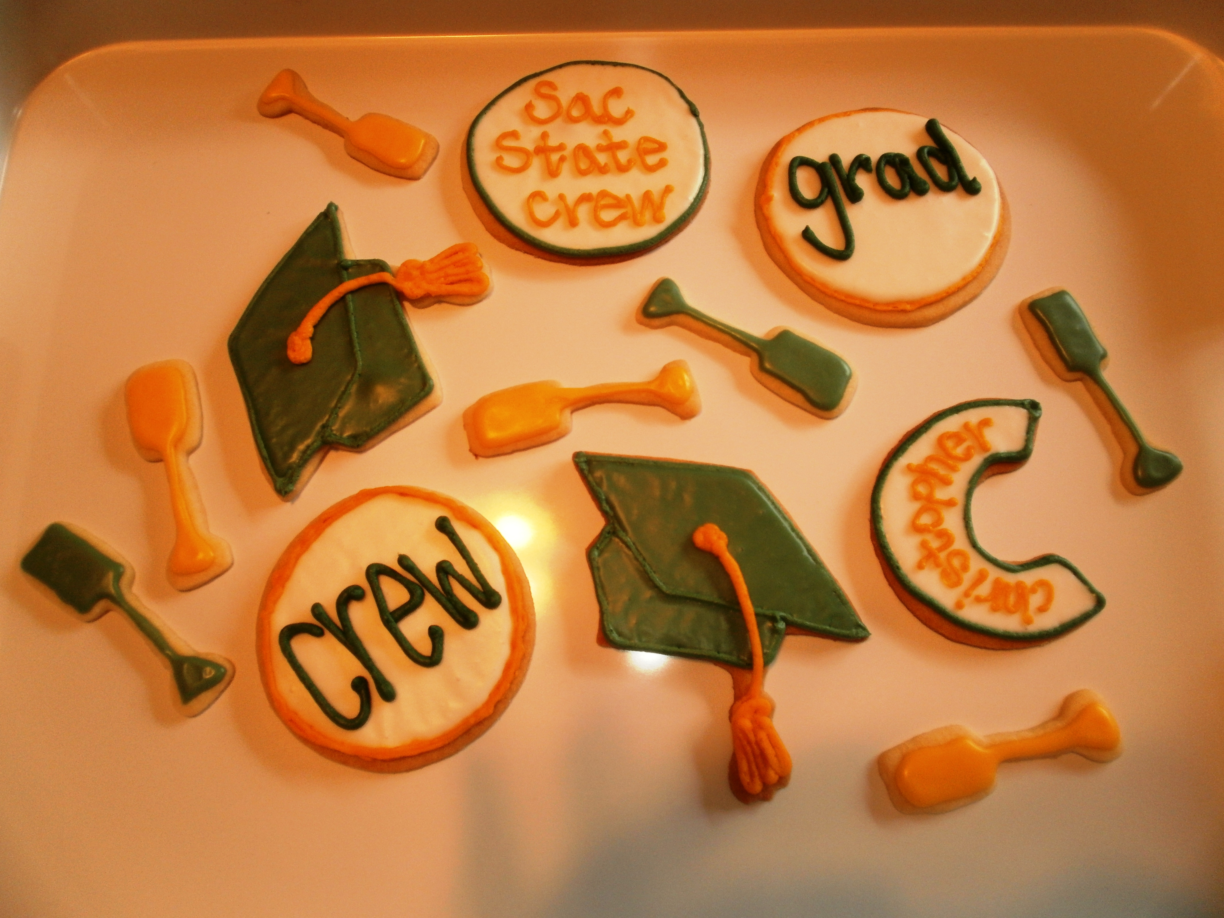 My little brother graduated from college and I made him cookies for his graduation party. He was on the crew team and it has become a big part of his life, so I also wanted to incorporate that into the cookies. Here are the new cutters I bought for his cookies (from cheapcookiecutters.com):