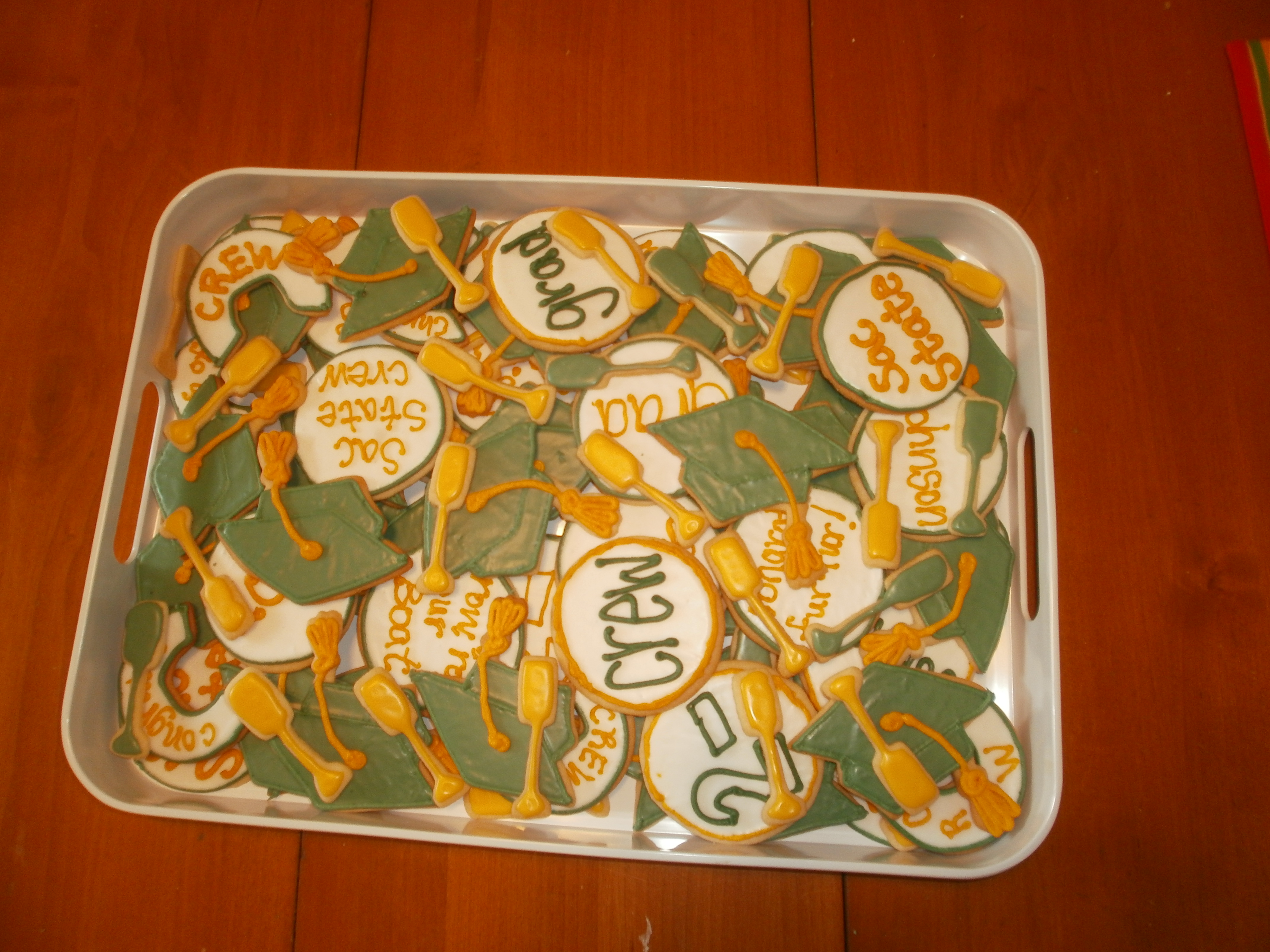 School colors are dark green and yellow/gold. (I had a hard time getting the green to get dark enough.) The oars were so small I decided not to even outline them, and it worked out okay. I just kept the icing a little farther from the edges and didn’t do too much so it wouldn’t run down.