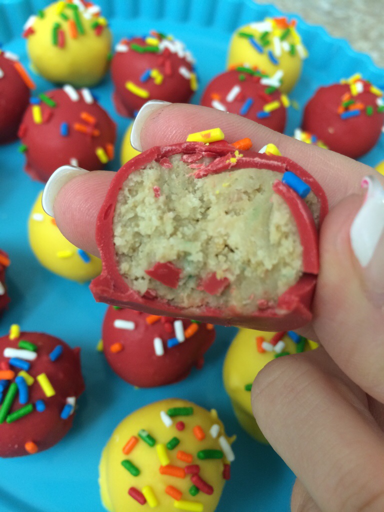 After the balls are all coated, pop the tray back in the fridge to harden up. Once they are set, eat one. Then peel them off the wax paper and break off the excess candy if possible.
