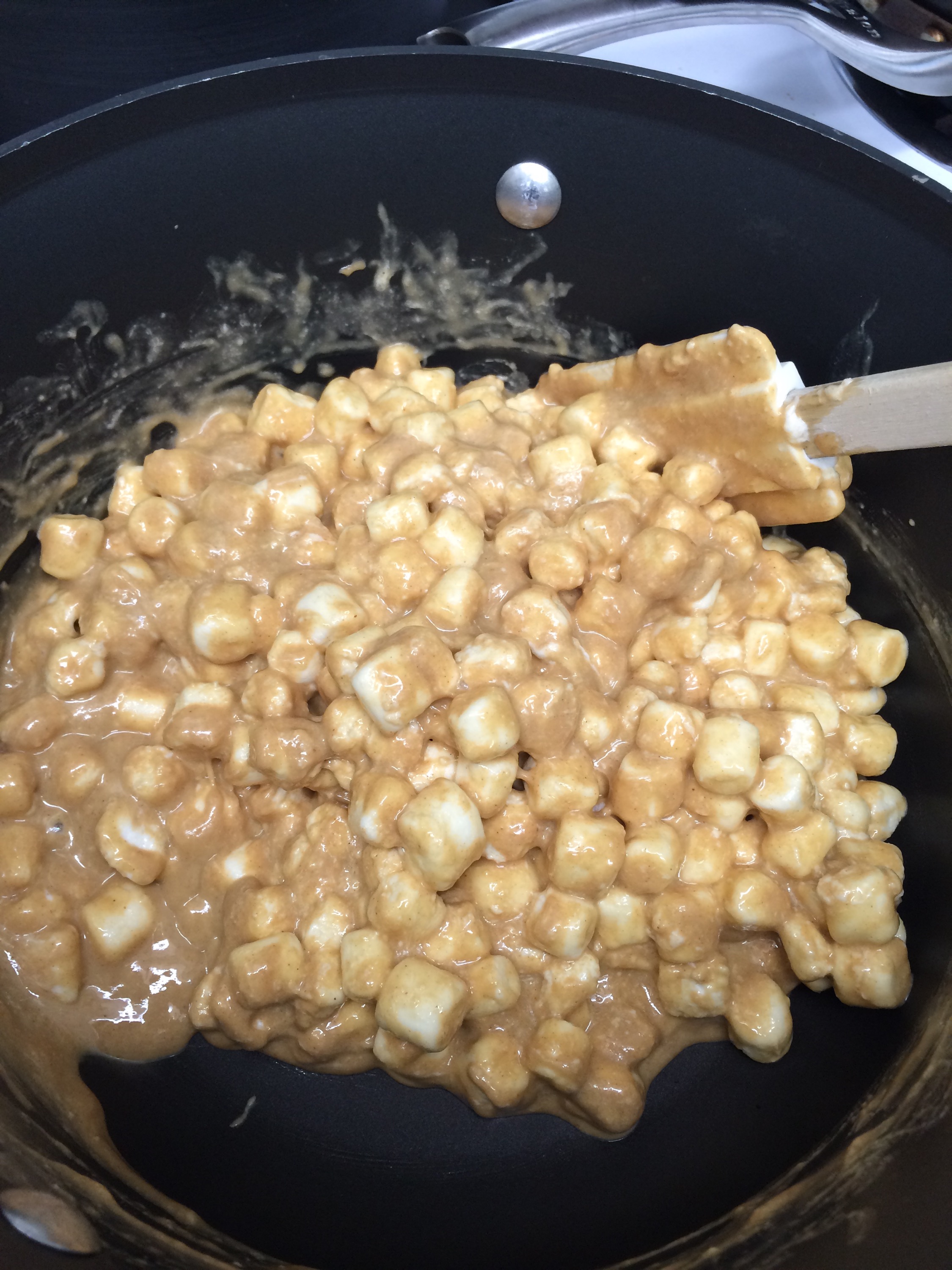 I followed the recipe on the cereal box (1/4 cup butter, 1 bag mini mallows, 6 cups cereal), and added 1 cup of creamy peanut butter to the pot with the butter and mallows.