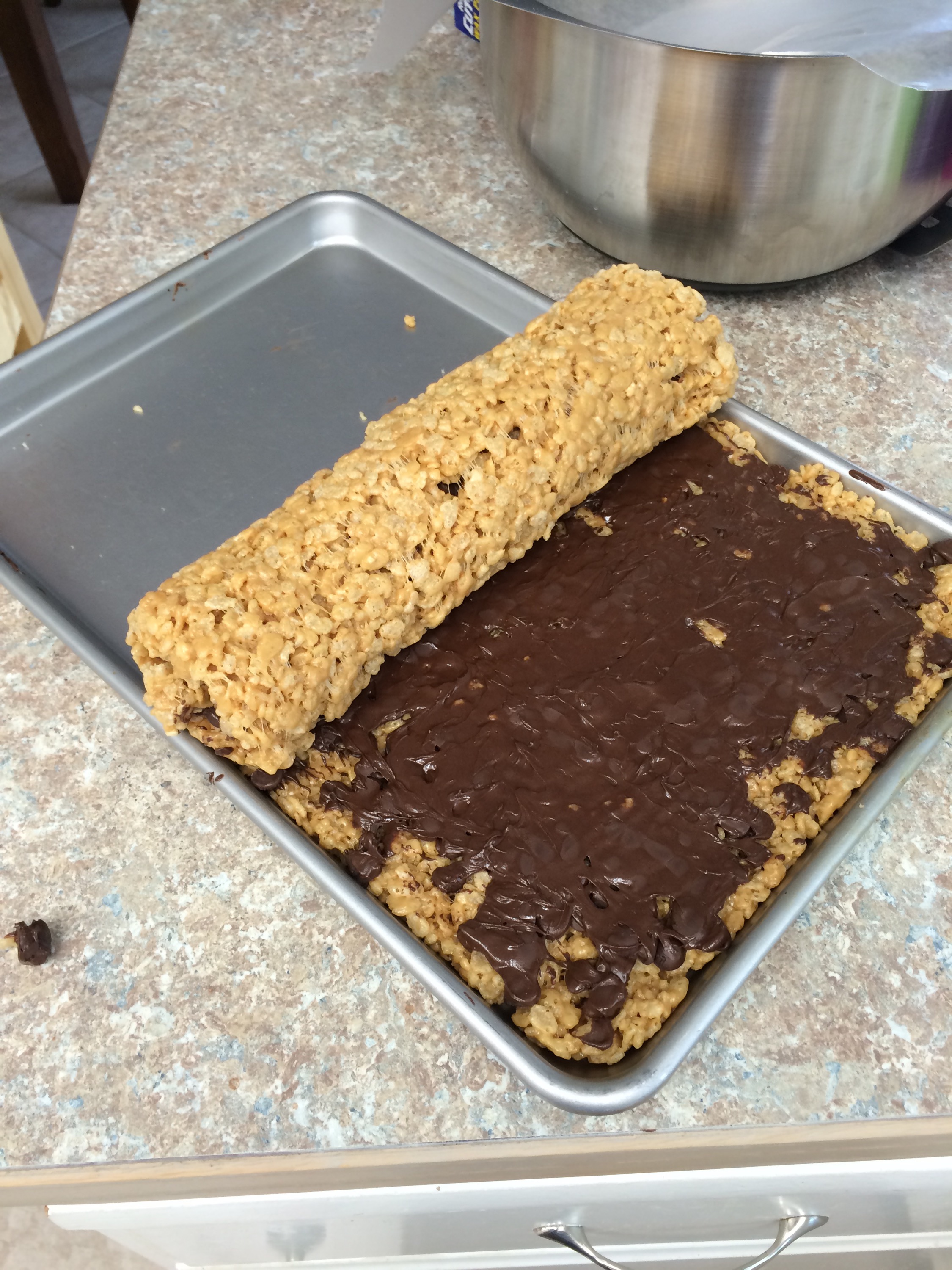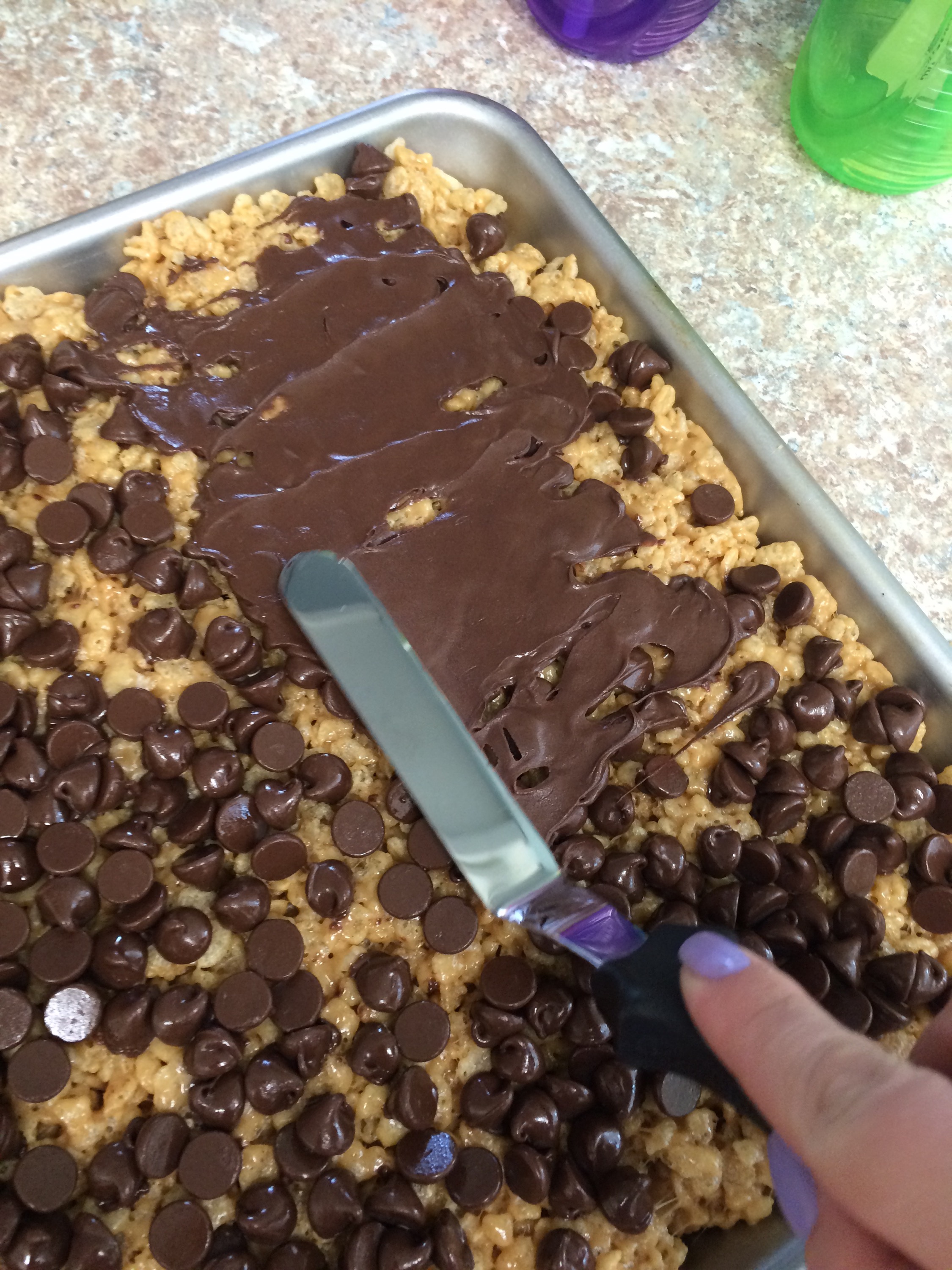 I pressed it into a sheet pan with greased up hands, then topped it with chocolate chips.