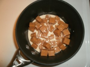 Unwrap caramels and put in small pot with 1/3 cup (half of the can) of evaporated milk. Turn on low and stir every once in a while to get things melty. We eventually want it to be smooth, but it can get started while we get the rest ready.