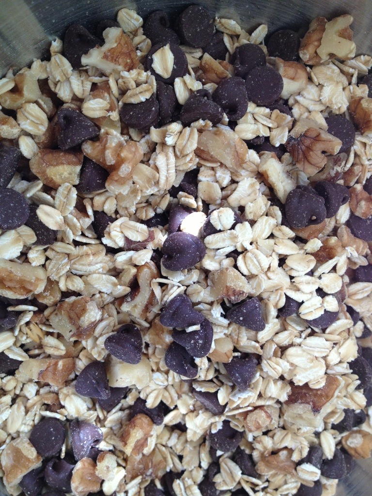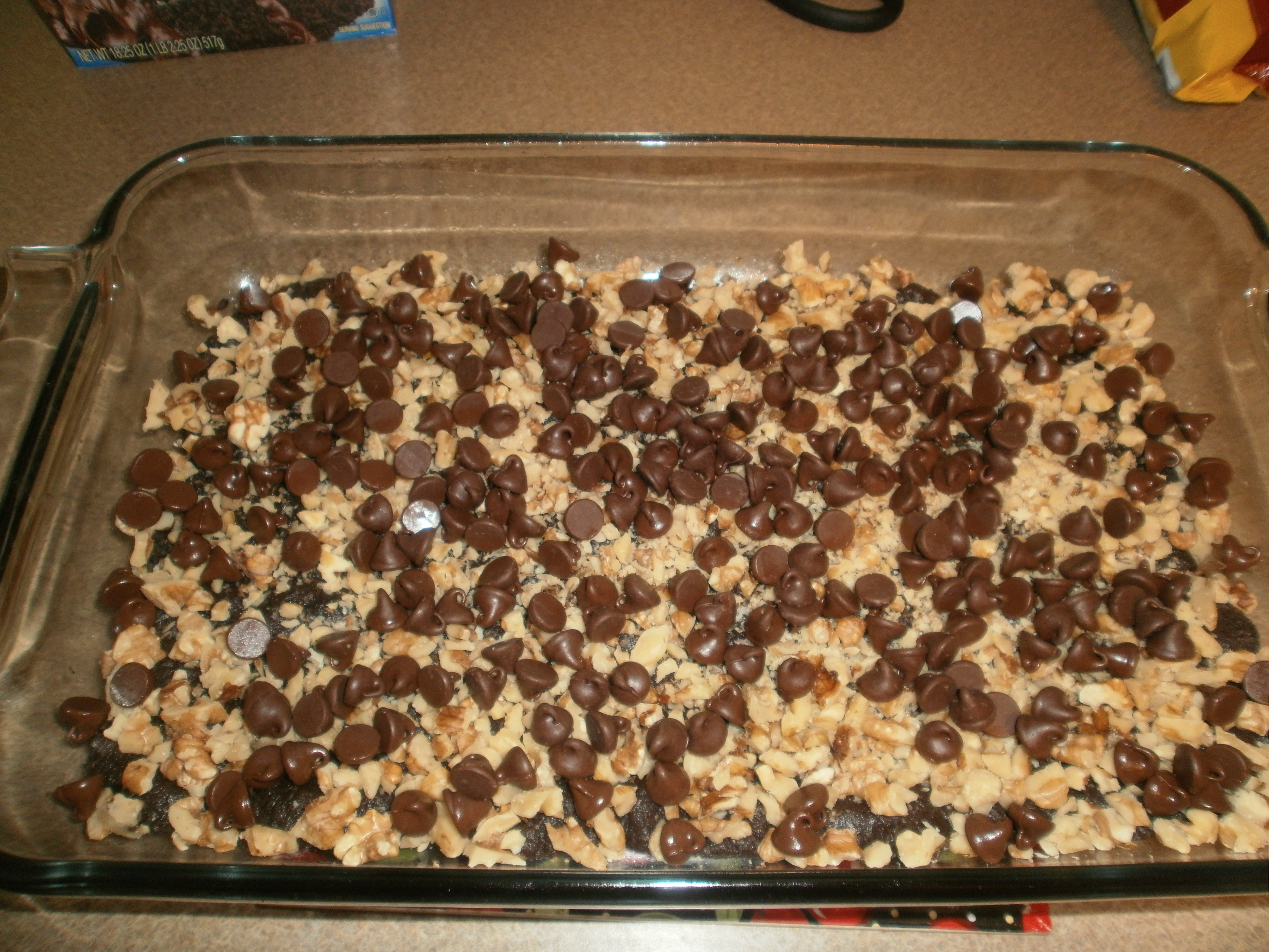 Pull the pan out of the oven and sprinkle 1 cup of chopped walnuts over the top of the dough, followed by the chocolate chips.