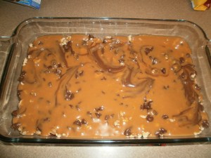 When the caramel is good and melty smooth, pour it evenly over the top of the chocolate chips. Don’t drool into the caramel!!!
