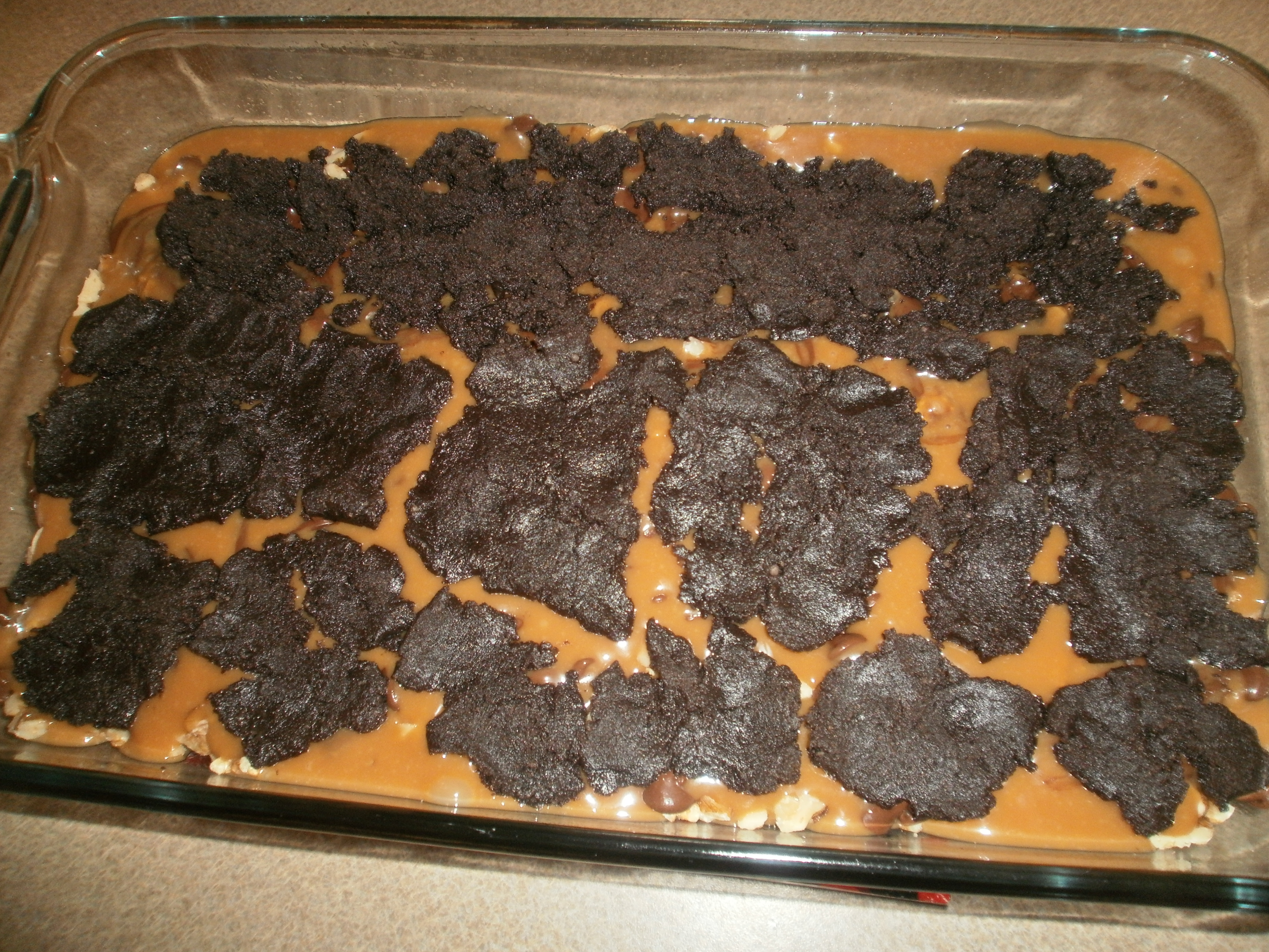 The rest of the cake/dough mixture goes on top. I tried to smoosh it down and it wasn’t working well with the caramel there. Instead I took small pieces of the dough and flattened it as much as I could with my fingers then laid it on top the caramel. It doesn’t need to be perfect, just as good of coverage as possible.